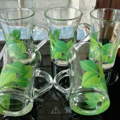 Ei iskeymiä tai halkeamia. Laseissa minimaalista käytönjälkeä.