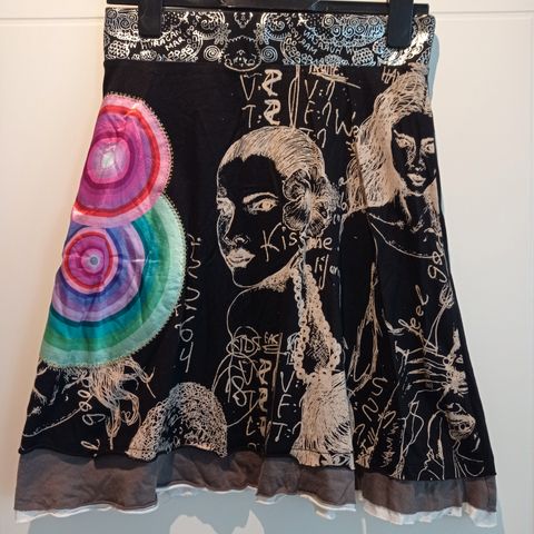 Uuden veroinen Desigual hame, koko L. Pituus 46cm. Vyötärön leveys venyttämättä n.42cm. Nappien alla pienet taskut. Takana vetoketju 14cm.