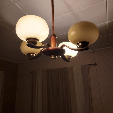 Mukana ajan henkeen sopiva bakeliitti kytkentä rasia. Kuvun levey on 40 cm ja korkeus 11cm. Lisäksi pallokupu ja valettu yläosa.