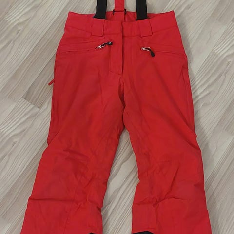 Lämpimät pinkit lasketteluhousut. Hieman kulumaa on havaittavissa takana ja polvien kohdalla.