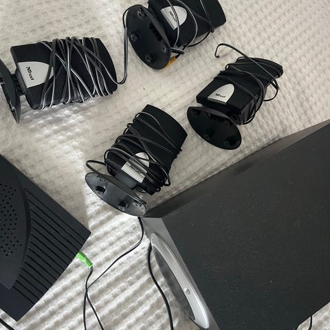 JVC 5.1-kanavainen kotiteatteri, joka muuttaa tavalliset DVD:t HD-laatuisiksi, sis. optinen sisäänmeno, antenniliitäntä ja subwoofer. Pääkaiuttimiksi Jamo Cornet 30 IV -kaiuttimet, tosi hyvät.