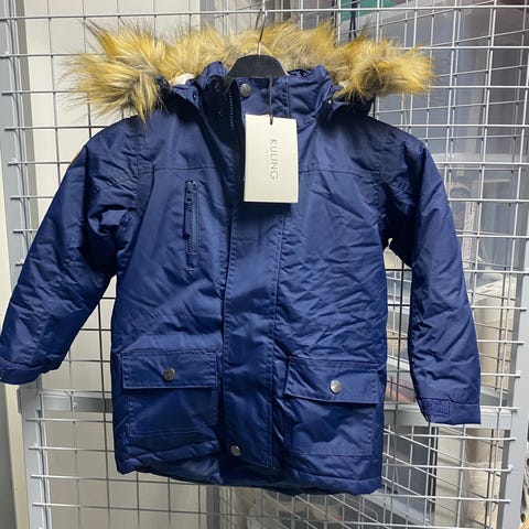 Vähäisellä käytöllä ollut takki. Koko 100 cm. Irrotettava karva hupun reunassa. Väri tummansininen.