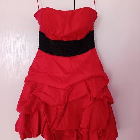 Näyttävä musta satiini juhlamekko. Takana vetoketju. Vyötäröllä ja yläosassa kauniit laskokset. Näyttävät olkaimet. Vuori. Koko EU 42. Merkki Dunnes Occasion. Materiaali päällinen 97 % polyesteri, 3 % elastaani, vuori 100 % polyesteri. Uusi laput kiinni.