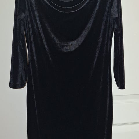 Uusi musta sametti mekko. Sametin tapainen pinta vinoruudukolla. Sivulla pitkä vetoketju. Takana koristevetoketju. Edessä taskut. Vuori. Koko 36 (38), UK 10, US 6, I 40, F 38. Merkki Esprit. Materiaali