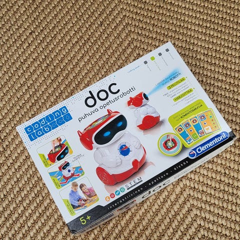 Doc on ohjelmoitava robotti, joka puhuu suomea ja ruotsia. Ikäsuositus 5+