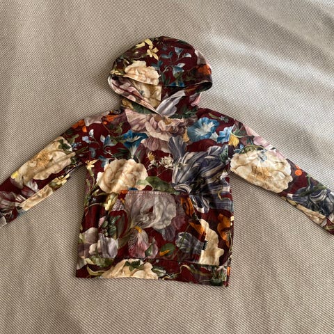Minikidin tyylikäs pitkänmallinen huppari koossa 110/116. Ehjä ja muutenkin hyvässä käytetyssä kunnossa. Hupparin etuosasta tahraa, joka tosin aika hyvin hukkuu kuosiin (ks. kuvat).