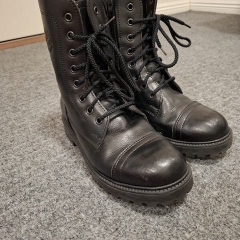 Käytetyt, mutta edelleen ok kunnossa olevat maiharit. Kengissä sisällä ohuehko villavuori.