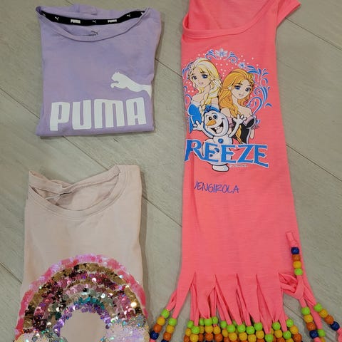 Vaatesetti, koko 128 (noin 8v), Tom Tailor paita +H&M housut. Kunto on käytetty, mutta hyvä. Housujen sisäsauman pituus 53 cm, paidan pituus 48 cm, hihan pituus kainalosta 38 cm.