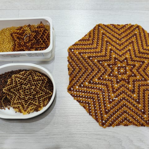Kaikki mikä kuvissa näkyy. Kolme purettavaa rikkinäistä kaulakorua, neljä uutta avaamatonta pakkausta ja monta pussia sekalaista.