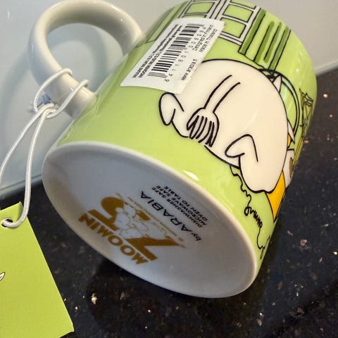 Muki on uusi. Tarra on paikoillaan.
