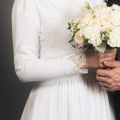 Kermanvalkoinen hääpuku pitkällä laahuksella, jonka saa myös nostettua napin avulla ylös.