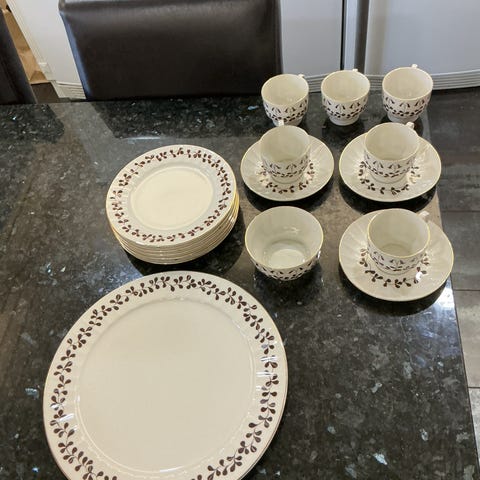 Myyn ehjän retro 1970 luvulta Esteri Tomulan suunittelemaa Arabian Vanamo sarjaa; pullatarjotin halkaisija 27,5cm, 4 kakkulautasta halkaisija 17,5cm, 5 teevatia halkaisija 13,5cm, 6 kuppia korkeus 6cm halkaisija 7cm, sokerikon korkeus 5cm halkaisija 9,2cm ja kermakko korkeus 5,2cm halkaisija 6,8cm.