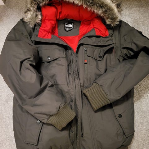 Hyväkuntoinen Tnf takki eteenpäin. Edessä pieni nirhauma, mutta ei näy oikeastaan.