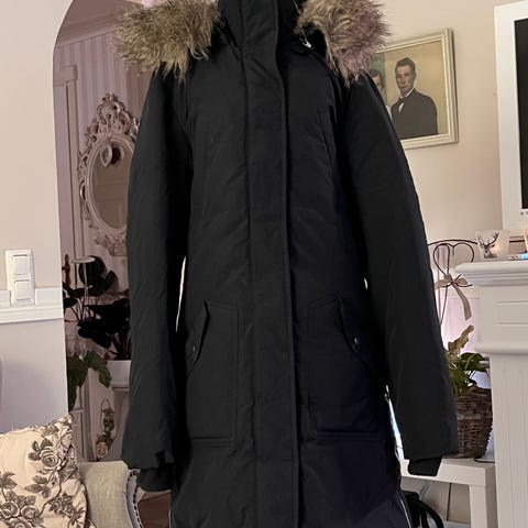 Vilan pitkä talvitakki, koko 36, mutta on ns.over size-malli, joten menee myös m-kokoa käyttävälle. Väri musta. Takissa on huppu. Muutoin hyväkuntoinen, mutta takin ripustuslenkki mennyt poikki, kohta korjattu vaateteipillä (katso kuva 3).