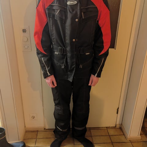 Musta-punainen Sinisalon ajopuku. Koko 40.