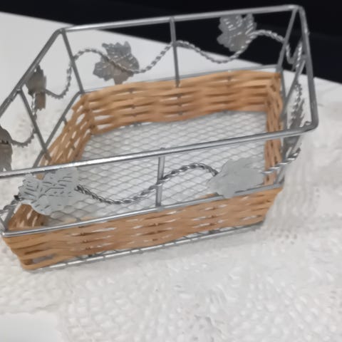 Marimekon vihreäkuvioisesta kaksinkertaisesta Bilopa-kankaasta ommeltu kuppi,läpimitta 21 cm, korkeus 11 cm, yläreunassa kovike, joka pitää reunan tukevana.
