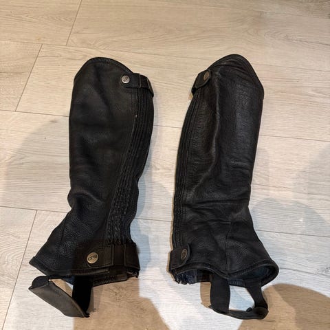 CRW nahkachapsit, koko XS, mustat. Leveys 32+cm, jousto vetoketjun sivussa, korkeus 36cm. Siistit ja ehjät, tomivat vetoketjut ja yläosan nepparit tallella.