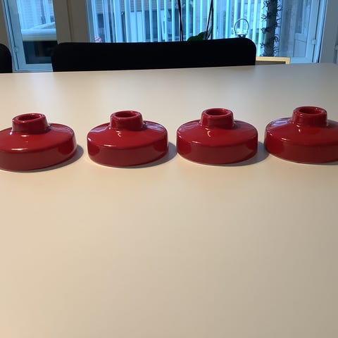 Arabian vuosia sitten valmistuksesta poistuneet pinottavat Pino-kynttilänjalat. Kynttilänjalka on halkaisijaltaan 9 cm. Värit: helmenharmaa (3 kpl) ja "korallin" oranssi (1 kpl). Myydään mieluiten yhdessä tai niin, että kolme helmenharmaata yhdessä ja oranssi erikseen. Laita viestiä, jos toive erikseen.