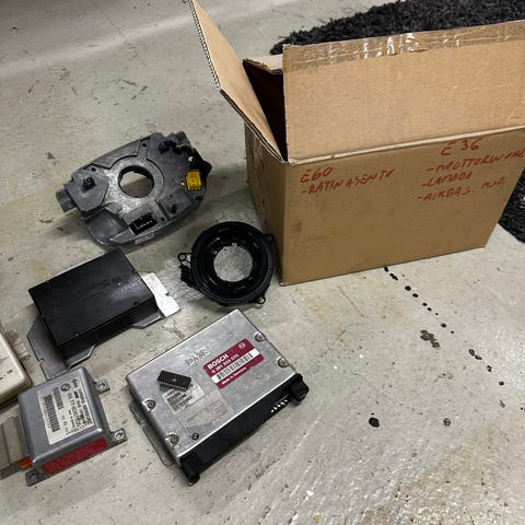 e34: 2x abs pumppuja, style 5 muovisia keskikuppeja 3kpl, vesiventtiili, m60 venakoppien muovit, hifi/luukullinen touring kattoverhoilu, 540ia touring moduuleja, etuvalojen ritilät, eteen oranssit vilkut, m60 startti, paljon kaikkea pikkusälää.