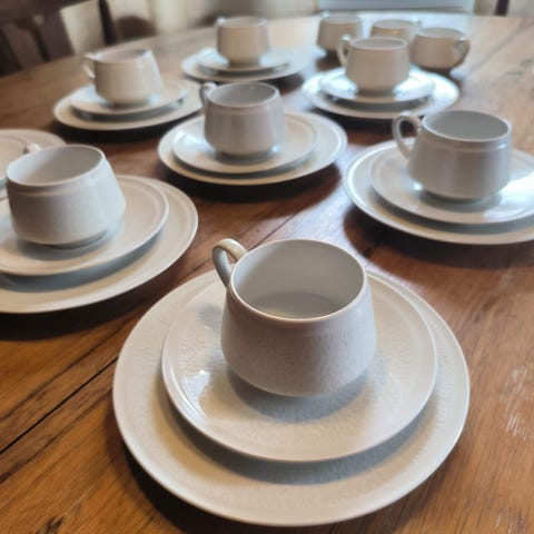Myydään Arabia Wärtsilä Finland , Raija Uosikkinen, virheettömät valkoiset 12 kpl Pitsi kahvikuppia, 12 asetit& 12 pullalautaset, sekä kermanekka.