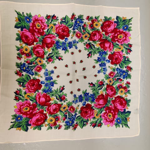 Hakusanat: Villahuivi huivi ruusuhuivi kukikas kukallinen ruusuinen vaalea villaa shaali kansallispuvun vintage kukkahuivi hartiahuivi