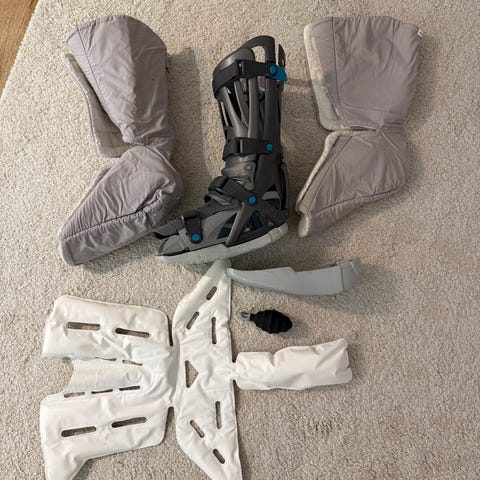 Akillesjännevamman hoitoon tarkoitettu akillesjänneortoosi koko noin 43-45. Käytetty 2 kk, pesty, uudenveroinen.