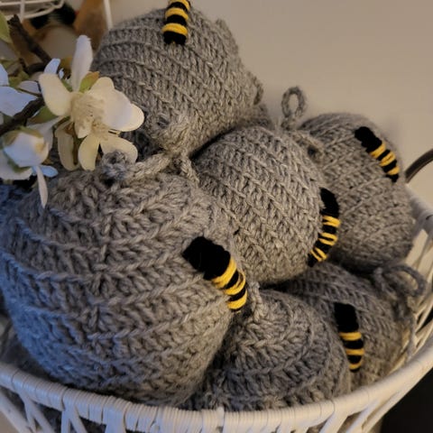 Virkattu vaaleanharmaa valeampiaispesä. Pinta materiaali 100 % puuvillaa.