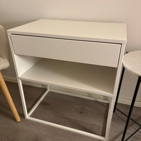 2 kpl valkoisia yöpöytiä, toisen laatikko lukolla. Mitat: lev 60 cm, kork 41 cm, syv 34 cm.