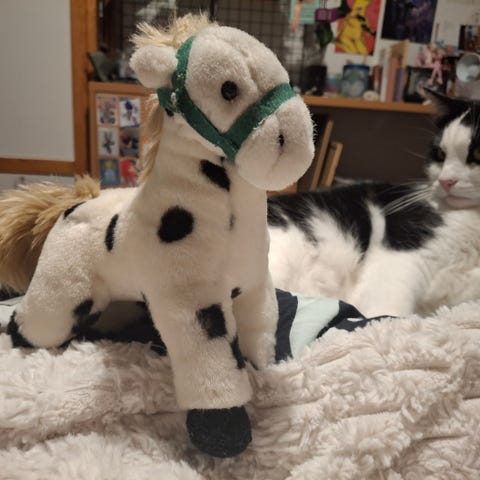 Pörröinen pegasos. Kulkee eteenpäin, hirnuu ja liikuttaa siipiä.