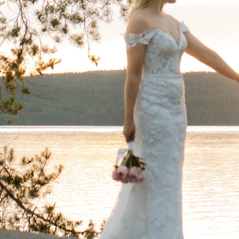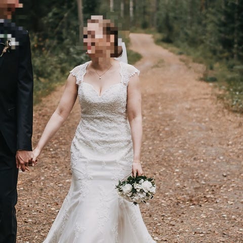 Tämä häämekko ostettu täältä, mutta löysinkin itselle sopivamman ja tämä jäi ylimääräiseksi. Yksissä häissä siis ollut ja mekko oli pesetetty häiden jälkeen. Mekko ollut pukupussissa säilytyksessä.
