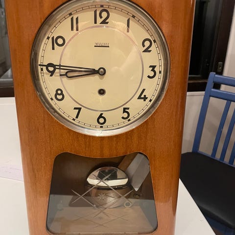 Myydään hyvin pidetty seinäkello. Kello joko jättää tai edistää hieman säätämällä saa kohdilleen