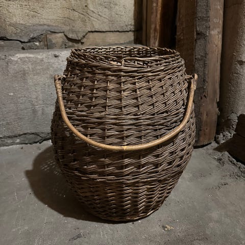 Metallilangasta punotut korit, puukahvat, korkeudet n.30cm, halkaisijat n. 30cm. Ovaalimallisen halkaisija n. 30cm x 40cm.