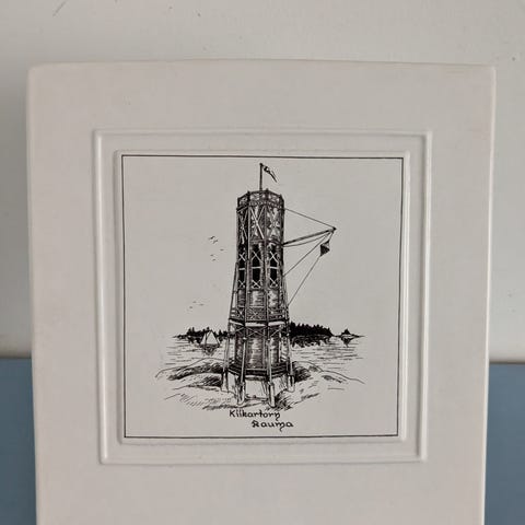Takana tarra jossa lukee "Tämä keraaminen seinätaulu kuuluu taiteilija Seppo Polameren Kerman Savi Oy:lle maalaamaan Riistalinnut sarjaan, johon kuuluvat metso, teeri, fasaani ja pyy. Kutakin aihetta on valmistettu vain 5000 kpl"