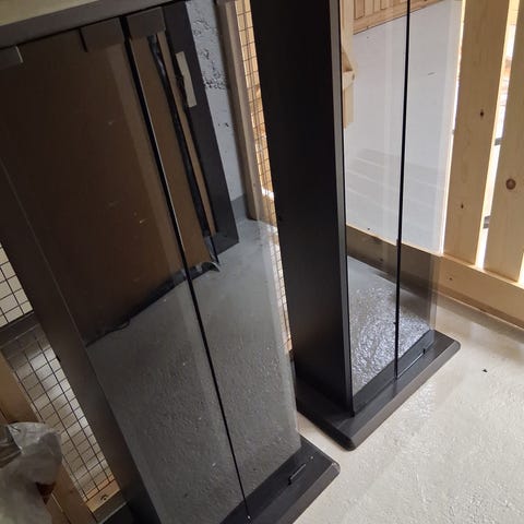Yhdestä puuttuu sivuilta DVD "ritilät", mutta hyllylevyt tekemällä saa toimivan kaapin.