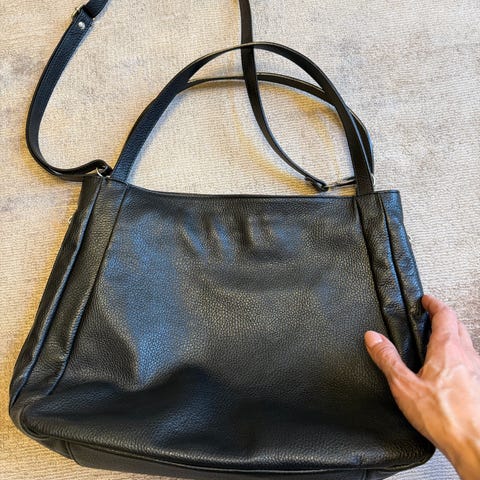 Musta olkalaukku aitoa nahkaa. Tilava laukku jossa paljon taskuja: edessä tilava etutasku läpän alla, kynätasku ja sivuilla syvät läpälliset taskut. Tukeva olkahihna jossa erillinen olkapehmike. Ostettu New Yorkista suoraan artesaanilta design kollektiivin liikkeestä. Laadukas ja hyväkuntoinen.