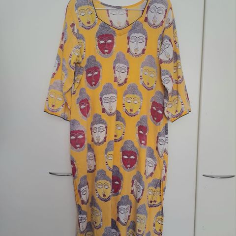 Puuvillainen intialainen anarkali mekko / juhlapuku. Hihaton. Kokoa ei tässä lue, mutta olin L kun tätä käytin (sittemmin saanut lapsia eikä tämä enää mene päälle joten lähtee eteenpäin). Olen 171 cm ja helma ulottui hieman polvien alle. Vetoketju toisella sivulla helpottamassa pukemista.