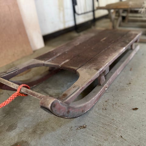 Vanha kelkka seuraavalle sukupolvelle käyttöön tai koristeeksi. Viimeksi ollut käytössä kesäkukkien telineenä. Kyläsepän tekemä