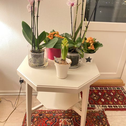 Kiva kukille vanha vuoden 1958 kukkakaakelipöytä täyttä puuta ja kaakelia. Ikä alkaa painaa ja muutama kaakelikin on kolhiintunut, kuten kuvissa, ja onhan jo vuosikymmeniä takana, mutta edelleen käyttökelpoinen. Korkeus 52,4 cm; pöytätaso 76,6 cm * 46,5 cm.
