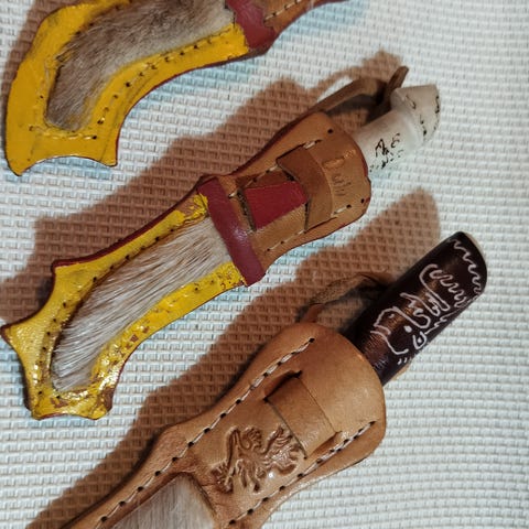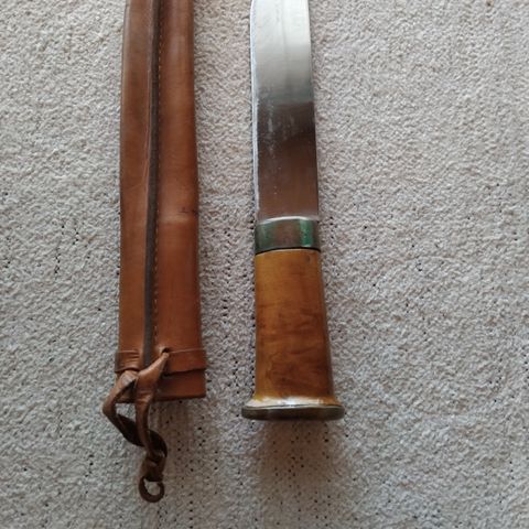 Pieni vintage matkamuisto, puukko ja tuppi. Liekö kahva ihan jotain luuta tms???