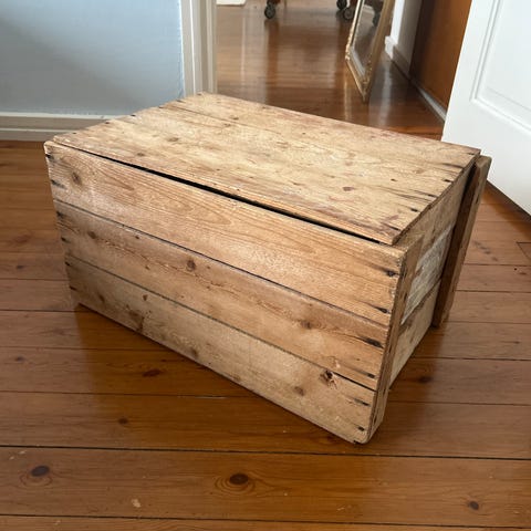 Kiva ja tukeva laatikko, joka ilmeisesti alunperin maalattu kalkkimaalilla. Puhdistettu myyntiin. Sisäkangasta ei ole pesty ja on tahrainen. Laatikossa reunoissa lievää vääntyilyä ja kulma auki sekä kupruilua pinnassa pesun jäljiltä. Kuitenkin erittäin käyttökelpoinen, kestää hyvin istumista eikä siis ole rakenteet löystyneet.