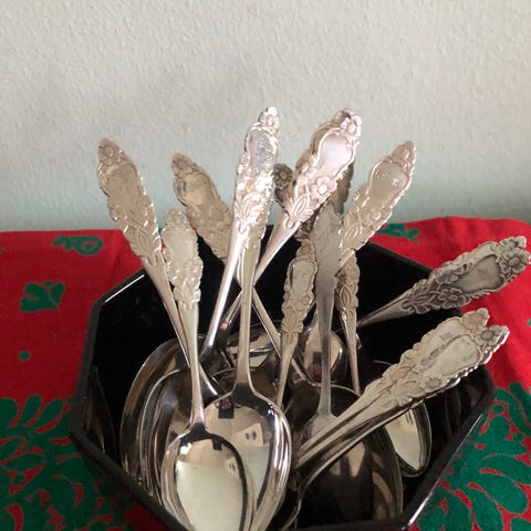 Lusikoita neljässä koossa 17 kappaletta , uushopea / alpakka , 70-luku