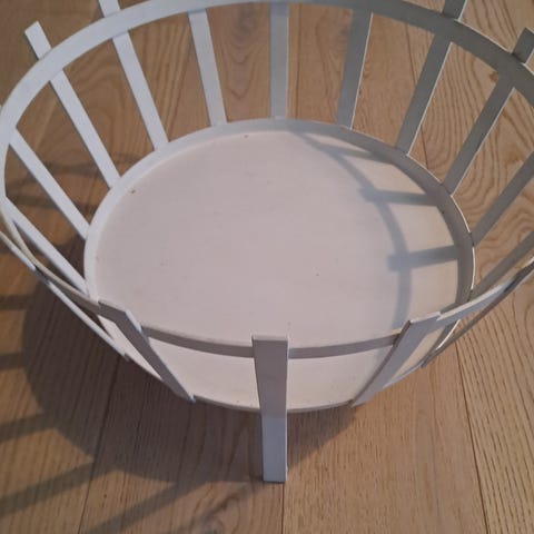 Rustiikkisen kaunis vaaleansininen lastukori, haalistunut, mutta muuten täysin ehjä. Tähän saisi hurmaavasti vaikka kukka-asetelman.