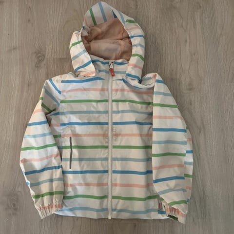 Kuvien mukainen Reiman takki. Hieman kiiltävähköä ja pehmeää joustavaa materiaalia. Irrotettava huppu, kaksi vetoketjullista taskua edessä sekä kaksi taskua sisällä. Pientä likaa siellä täällä ja toinen taskun vetoketju ei mene kokonaan alas asti. Taskujen heijastimissa pientä kulumaa. Yleisilmeeltään siisti takki. Ei rispautumia eikä "kulumavaalentumia". Koiratalous joten jokunen karva voi tulla mukana putsauksesta huolimatta.