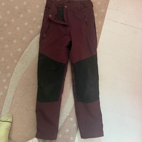 Kunto hyvän ja kohtalaisen välillä, koska polvissa on vähän tummentumaa ja yksi kuluma kankaassa. Muuten vielä hyvin käyttökelpoiset housut.