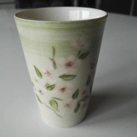 Myydään kuvassa oleva vanha beige posliini maljakko.