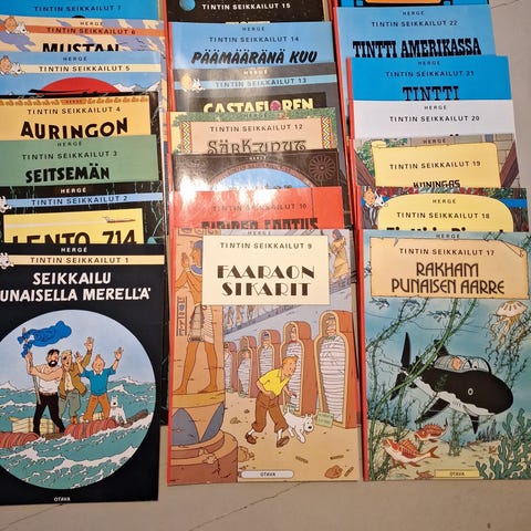 - Tuplatintti 1 (Faaraon sikarit & Sininen lootus). Faaraon sikarit - osiosta puuttuu muutama sivu alusta, kansilehti irronnut, korjattu teipillä, Sininen lootus hyvässä kunnossa). Kuntoarvio tyydyttävä/hyvä.