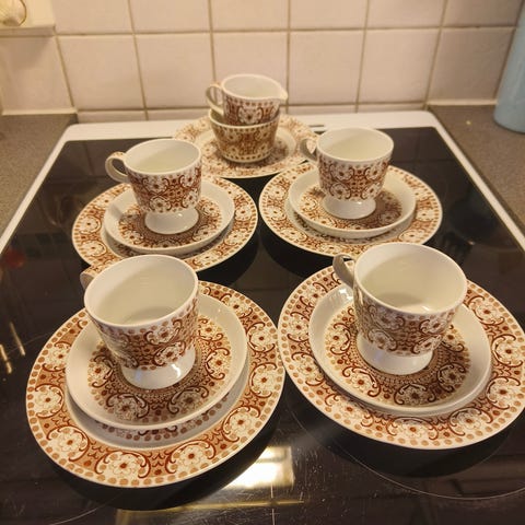 7 Kahvikuppia asetteineen, 7 kpl pullalautasia sekä kermanekka. Hyväkuntoiset.