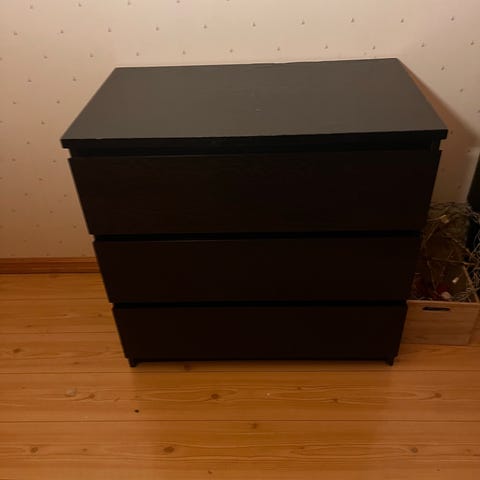 Hyvässä kunnossa oleva lipasto. Keskimmäinen laatikko on kellastunut, ollaan ostettu käytettynä ja oli silloin jo.