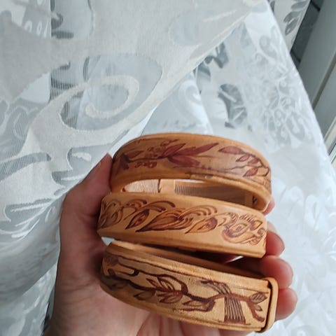 Nahka teräs rannekoru jossa lukee nahan pinnassa kiitollinen...teräs on ruosrumatonta..pidetty vähän..sormus myös nahkaa nappi malli..säädettävä sormus..hibta yhteensä näillä Verandan design koruilla kotimaista käsityötä..nahka on mustaa....pysyy hyvin ranteessa sormessa