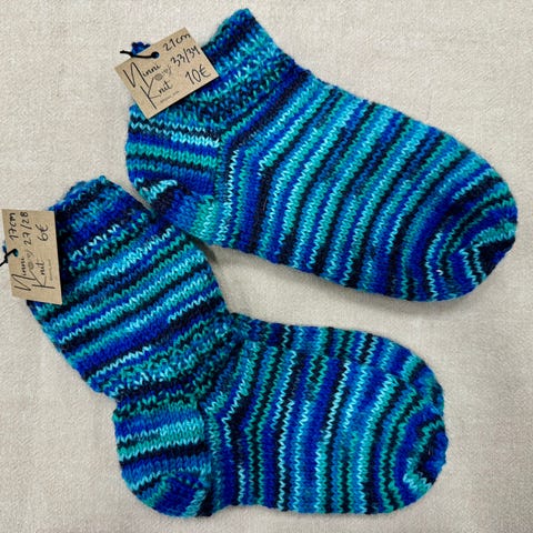 Käsintehdyt malatavartiset villasukat sinisävyiset kokoa 33/34.